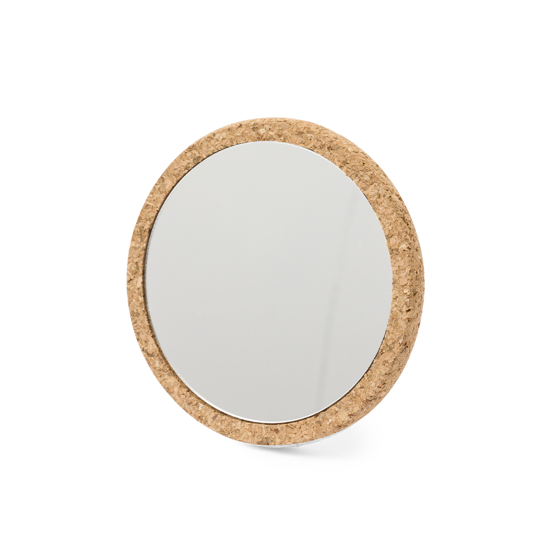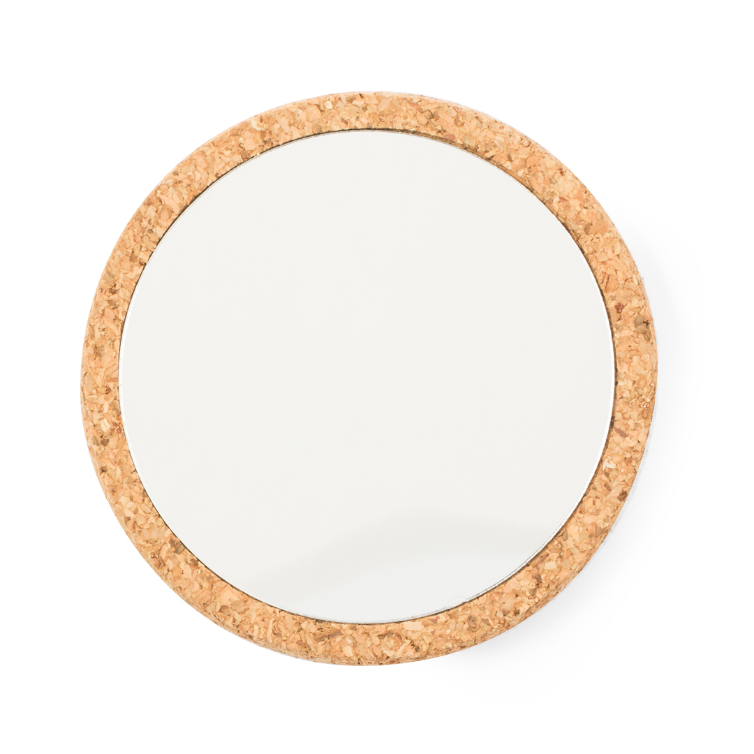 Espejo 1X fabricado en corcho. Práctico espejo portátil recubierto de suave corcho y presentado en una caja individual diseño kraft. Corcho