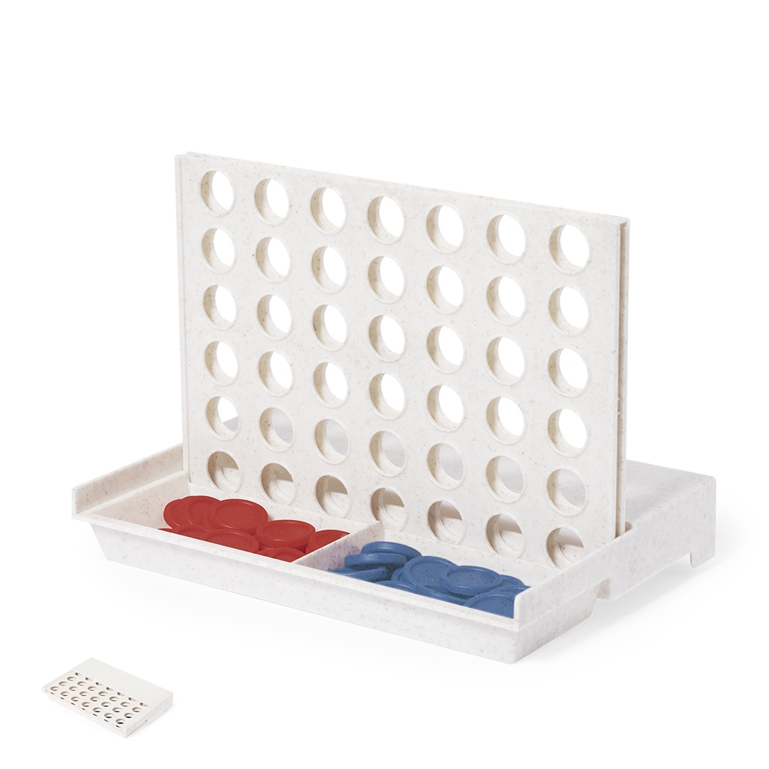 Divertido juego de mesa fabricado en caña de trigo. Compuesto por un tablero vertical y 42 piezas circulares (21 rojas y 21 azules). Emoción para todas las edades introduciendo las fichas por las ranuras para conseguir 4 fichas en 1 misma fila. Fácil de montar por su tablero móvil pudiendo desplegar o plegar. Presentado en caja de diseño kraft. 42 Piezas Caña de Trigo/ ABS